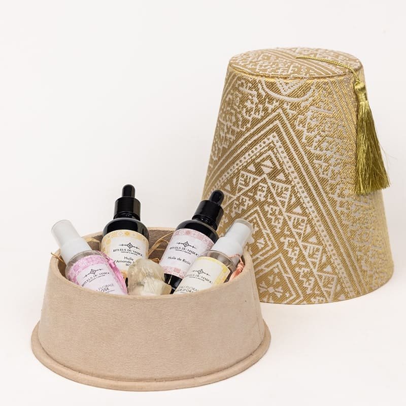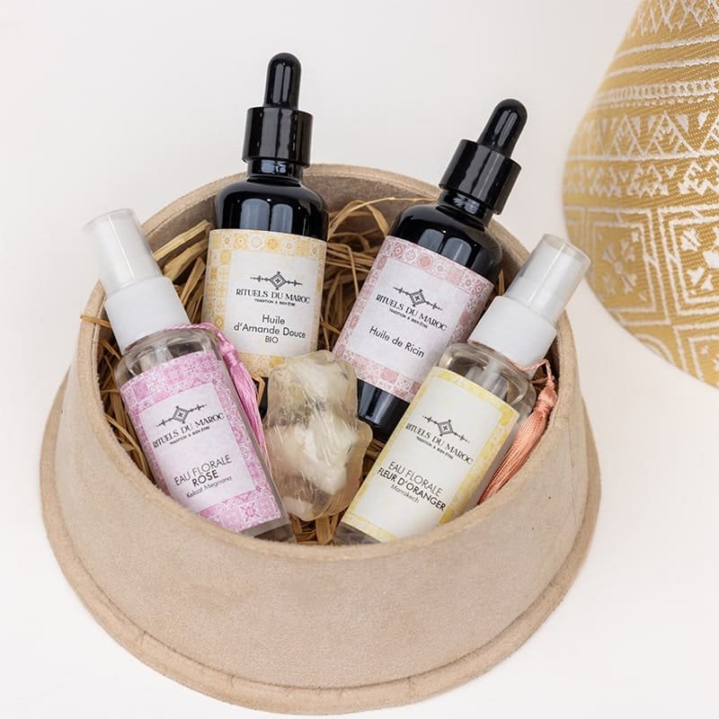 Le Coffret Rituel Douceur est composé d’Eau de Rose, d’Eau de Fleur d’Oranger, d’Huile de Ricin, d’Huile d’Amande Douce Bio et de la Savonnette Khmissa au Jasmin est une sélection raffinée de soins naturels inspirés des rituels marocains. Conçu pour nourrir, hydrater et apaiser la peau tout en prenant soin des cheveux, ce coffret propose une expérience sensorielle complète, idéale pour une routine beauté naturelle et quotidienne. Il combine des ingrédients doux et authentiques, soigneusement choisis pour leurs vertus nourrissantes, protectrices et régénérantes.