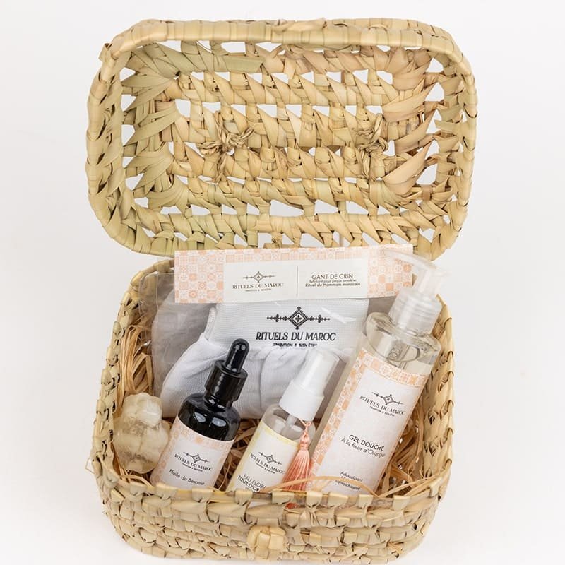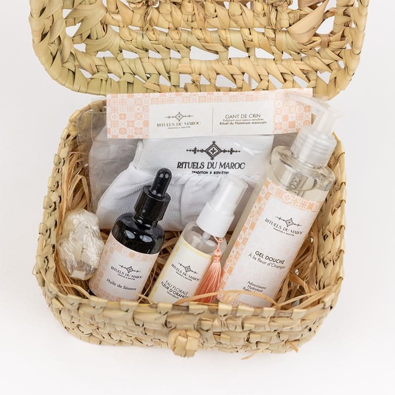 Le Coffret Rituels Corps a été conçu pour offrir un rituel complet de soins naturels inspirés des traditions marocaines, afin de nourrir, hydrater et sublimer la peau. Il comprend l’Eau de Fleur d’Oranger 50ml, l’Huile de Sésame 50ml, le Gel Douche à la Fleur d’Oranger 200ml, le Gant Kessa exfoliant et la Savonnette Khmissa au Jasmin. Ce coffret associe nettoyage, exfoliation et nutrition pour une peau souple, lumineuse et parfaitement protégée.